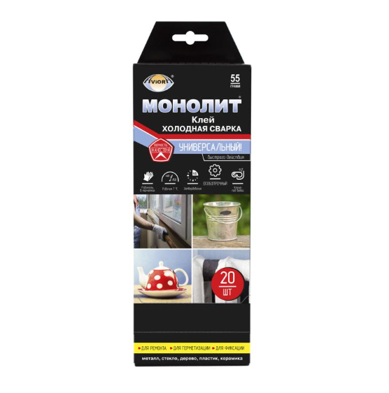Клей — холодная сварка УНИВЕРСАЛЬНЫЙ быстрого действия «МОНОЛИТ» — это двухкомпонентная, быстросхватывающая эпоксидная масса для склеивания различных материалов между собой, таких как: стекло, дерево, пластик, металл, керамика, а также герметизации механических повреждений виде отверстий и трещин. Диаметр повреждений не должен превышать 10мм, в противном случае необходимо дополнительное применение заплатки. Образует прочные сварные швы, которые могут подвергаться механической обработке. Отлично подходит для ремонта и герметизации радиаторов отопления, починки картера автомобиля и выхлопной трубы, ремонта труб горячего и холодного водоснабжения, ремонта керамических и стеклянных изделий, заделке пробоин в железных ёмкостях.